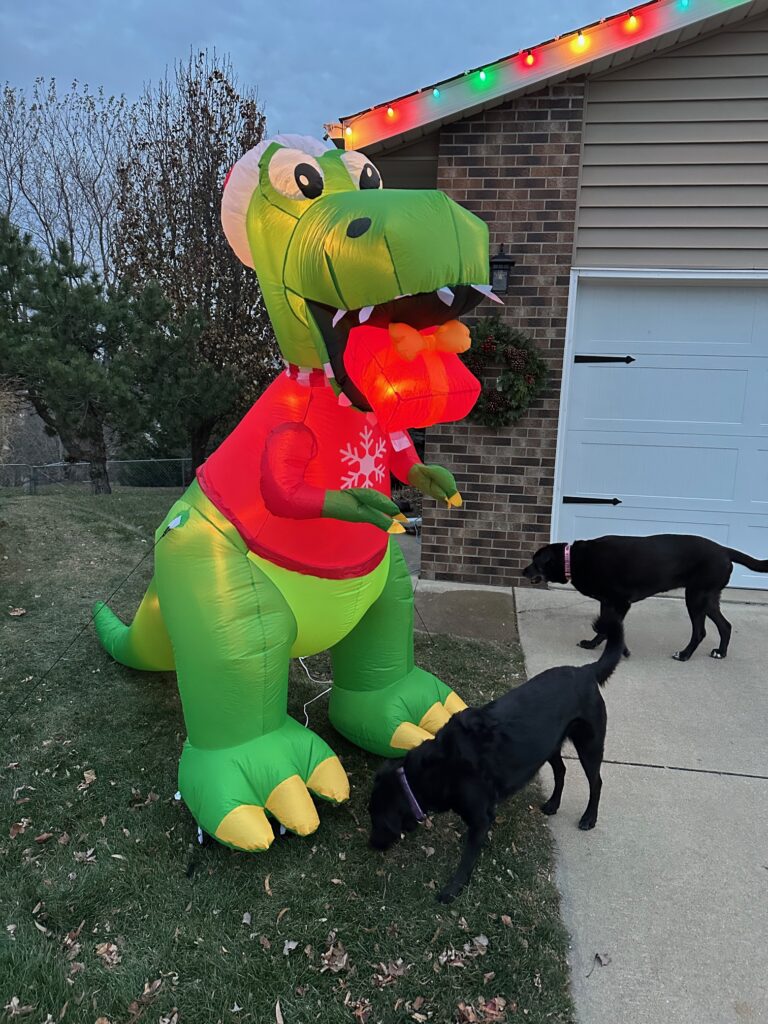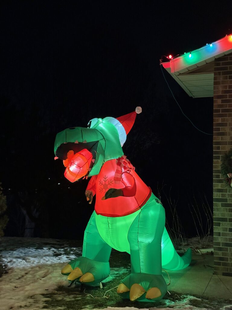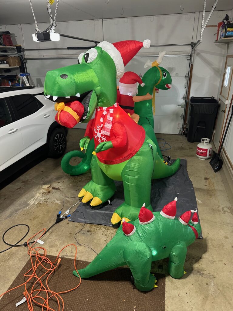 Several years ago, we added a T-rex inflatable to our Christmas decorations, and it quickly became one of my favorites. There’s just something fun about mixing dinosaurs with the holiday season. Over time, the collection has grown to include a brontosaurus and a stegosaurus as well.