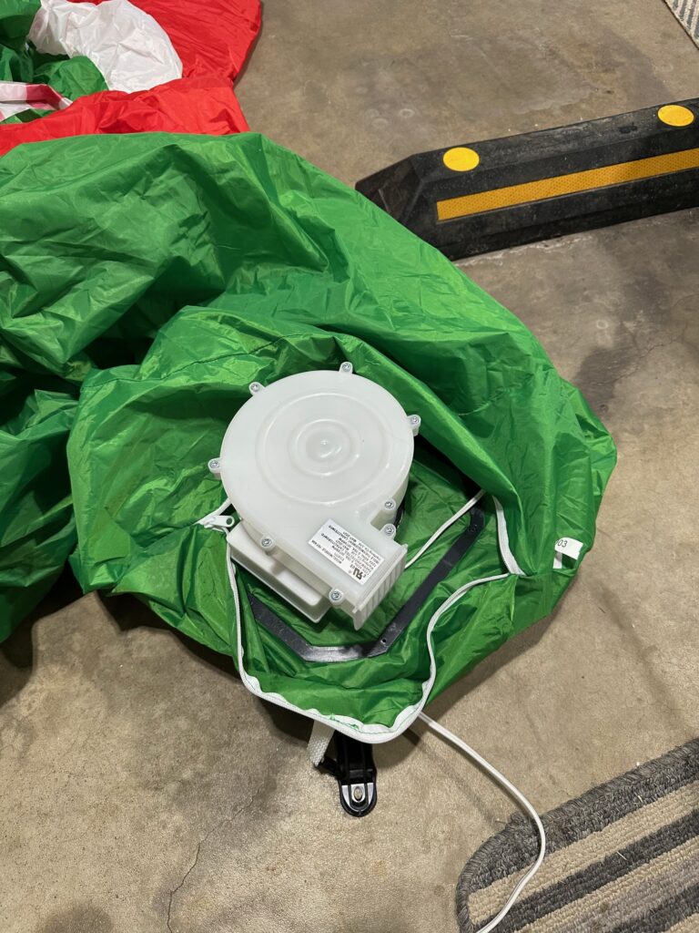 Once everything was wired up, I hung the inflatable from a bungee cord attached to the garage ceiling, flipped it inside-out, and secured the new wiring to the original tie-down points inside the dinosaur. After carefully flipping it back right-side-out, I reattached the fan unit and powered it on.